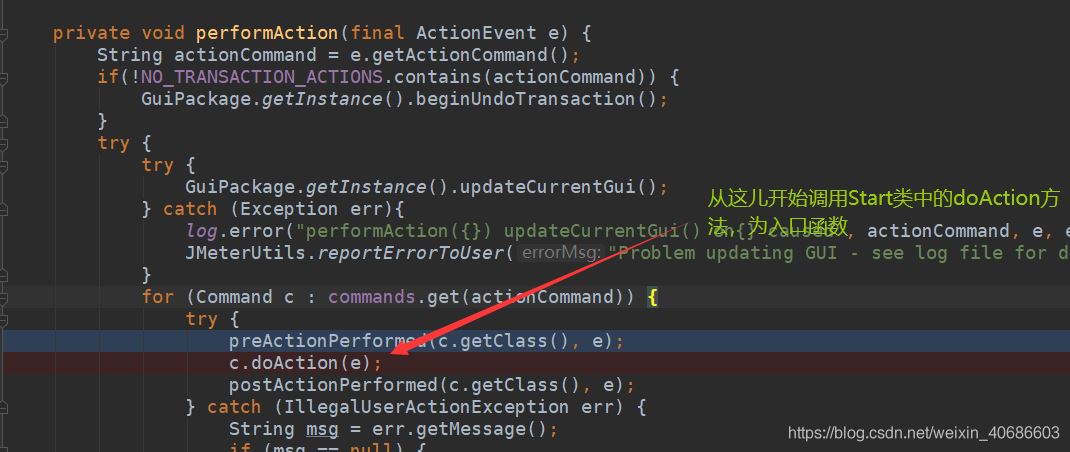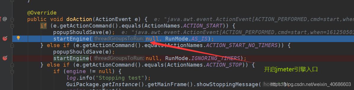 2. 进入Start类中doAction方法,会调用startEngine函数,表示开启jmeter引擎,当然不是里面开启,会在该函数进行一系列前置处理
