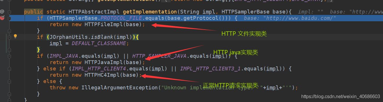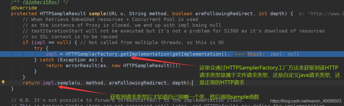 上图打进去后会进入HTTPSampleProxy类调用sample函数,通过HTTPSamplerFactory工厂方法来获取请求类别