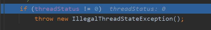 在start()内部,这里有一个threadStatus的变量。如果它不等于0,调用start()是会直接抛出异常的。