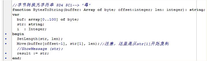 //字节转换为字符串 $D4 $C1--> '粤' function BytesToString(buffer: Array of byte; offset:integer; len: integer): string; var str: string; i : Integer; begin SetLength(str, len); for i:=0 to len-1 do begin if buffer[offset-1+i]=0 then break; //遇到ASCII 0不再复制! Move(buffer[offset-1+i], str[1+i], 1);//注意,这里是从str[1]开始复制的 end; //Move(buffer[offset-1], str[1], len);//注意,这里是从str[1]开始复制的 //ShowMessage (str); SetLength(str, i); result := str; end;