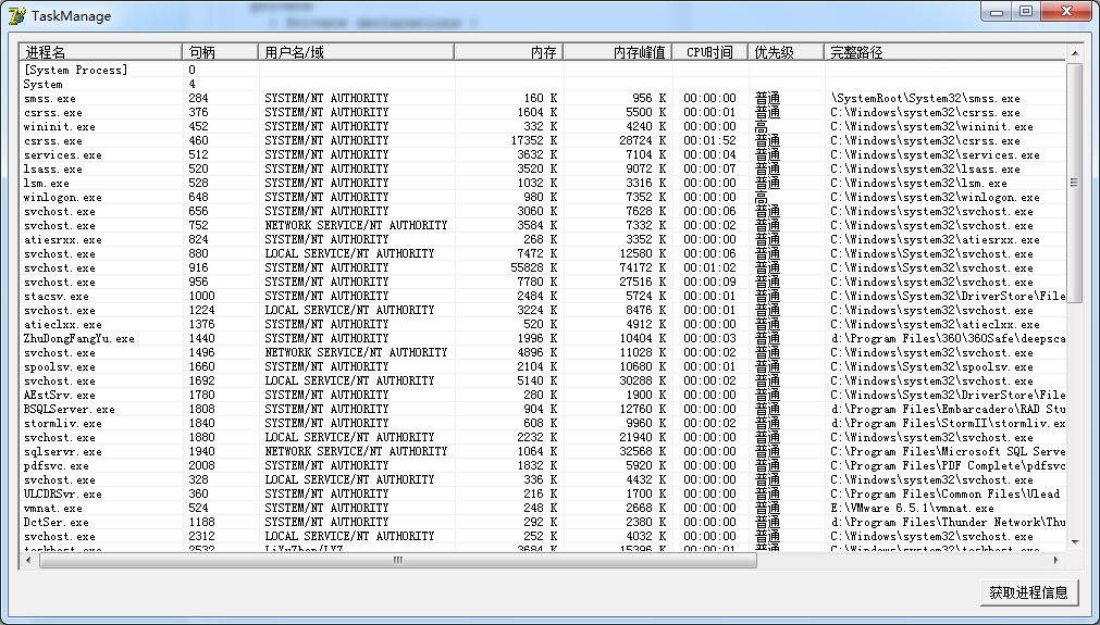 闲着没事,看着任务管理器好玩,查资料先简单实现一下,代码中没有加入获取CPU占用率的代码,这个代码网上很多,只是不喜欢那种写法,这里就不写了。以后继续完善,对于System Process和System的信息还没法获得,那位兄弟知道可以提个醒。