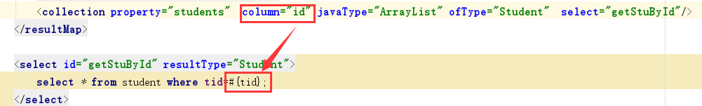 <collection property="students" column="id" javaType="ArrayList" ofType="Student" select="getStuById"/>