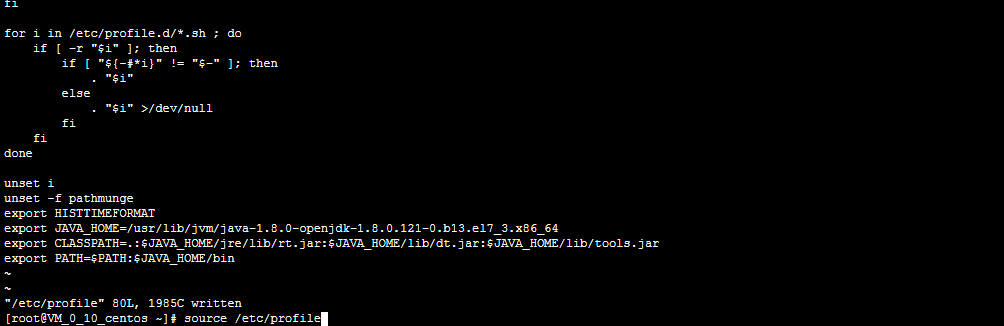 export JAVA_HOME=/usr/lib/jvm/java-1.8.0-openjdk-1.8.0.121-0.b13.el7_3.x86_64(注意这行是照着别人写的,结果报错,我使用的下面那一行。具体看安装的版本,请自行替换) export JAVA_HOME=/usr/lib/jvm/java-1.8.0-openjdk-1.8.0.191.b12-1.el7_6.x86_64 export CLASSPATH=.:$JAVA_HOME/jre/lib/rt.jar:$JAVA_HOME/lib/dt.jar:$JAVA_HOME/lib/tools.jar export PATH=$PATH:$JAVA_HOME/bin