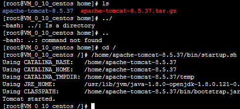 执行命令:/home/apache-tomcat8.5.37/bin/startup.sh(这个命令第一次安装是用成功了,后面还是要进入bin目录下,在输入启动命令,末尾有介绍)