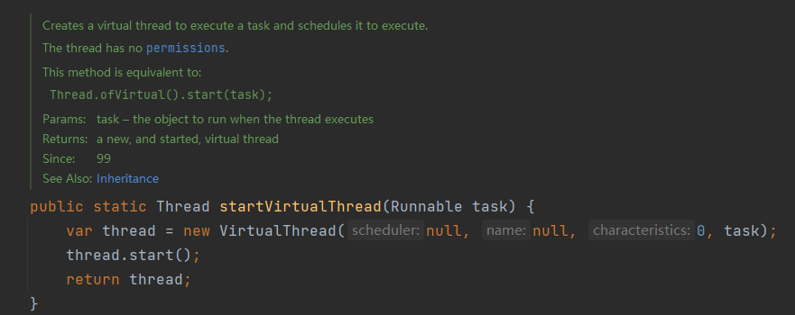 当前版本Loom项目中协程使用并没有引入一个新的公开的虚拟线程VirtualThread类,虽然真的存在VirtualThread,但这个类使用default修饰符,隐藏在java.lang包中,并且VirtualThread是Thread的子类。协程的创建API位于Thread类中: