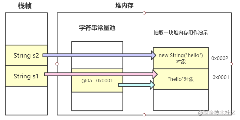 上面的代码中( String s1 = "hello")虚拟机首先会到字符串常量池中查找是否有存在hello字符串对应的引用。发现没有后会在堆内存创建hello字符串对象(内存地址0x0001),然后到字符串常量池中注册地址为0x0001的hello对象,也就是添加指向0x0001的引用。最后把字符串对象返回给s1。