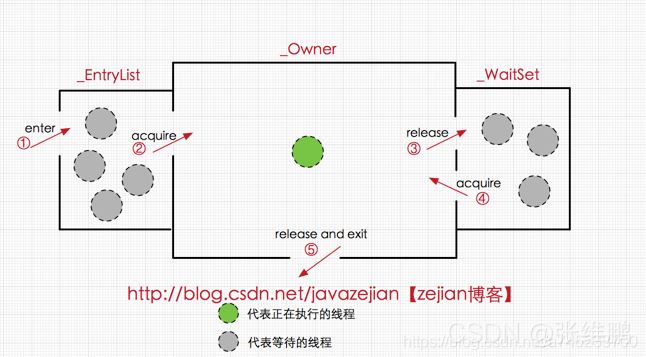 synchronized 锁机制在 Java 虚拟机中的同步是基于进入和退出监视器锁对象 monitor 实现的(无论是显示同步还是隐式同步都是如此),每个对象的对象头都关联着一个 monitor 对象,当一个 monitor 被某个线程持有后,它便处于锁定状态。在 HotSpot 虚拟机中,monitor 是由 ObjectMonitor 实现的,每个等待锁的线程都会被封装成 ObjectWaiter 对象,ObjectMonitor 中有两个集合,WaitSet 和 _EntryList,用来保存 ObjectWaiter 对象列表 ,owner 区域指向持有 ObjectMonitor 对象的线程。当多个线程同时访问一段同步代码时,首先会进入 _EntryList 集合尝试获取 moniter,当线程获取到对象的 monitor 后进入 _Owner 区域并把 _owner 变量设置为当前线程,同时 monitor 中的计数器 count 加1;若线程调用 wait() 方法,将释放当前持有的 monitor,count自减1,owner 变量恢复为 null,同时该线程进入 _WaitSet 集合中等待被唤醒。若当前线程执行完毕也将释放 monitor 并复位变量的值,以便其他线程获取 monitor。如下图所示: