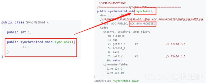 synchronized 分为显式同步(同步代码块)和隐式同步(同步方法),显式同步指的是有明确的 monitorenter 和 monitorexit 指令,而隐式同步并不是由 monitorenter 和 monitorexit 指令来实现同步的,而是由方法调用指令读取运行时常量池中方法的 ACC_SYNCHRONIZED 标志来隐式实现的。