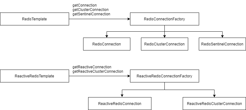 spring-data-redis 核心接口与背后的连接相关抽象关系为: