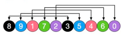增量为 5 的这一轮排序后:[3, 5, 1, 6, 0, 8, 9, 4, 7, 2]