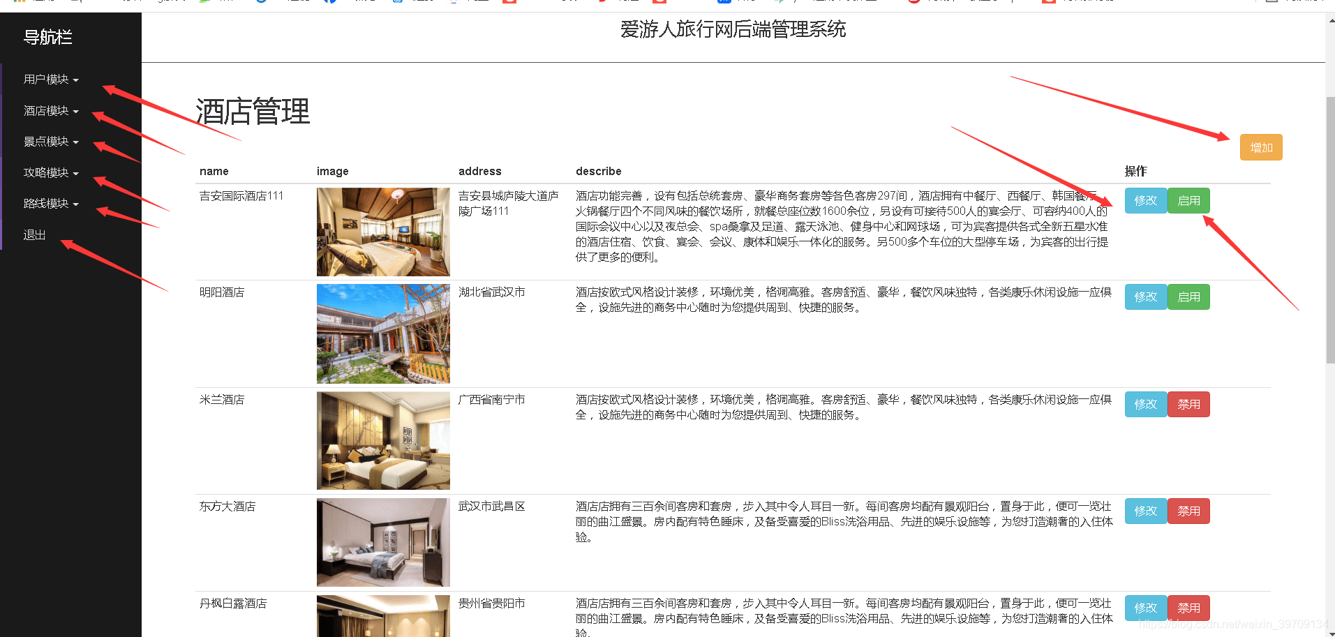 后台管理模块主要是一些基础数据的维护和管理、具体有用户管理、酒店信息管理、景点信息管理、攻略信息管理、路线信息管理、发布功率审核、以及登录退出等