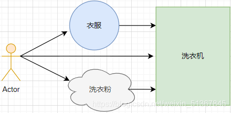 而整个洗衣服的过程就是:人将衣服放进洗衣机、人倒入洗衣粉、人启动洗衣