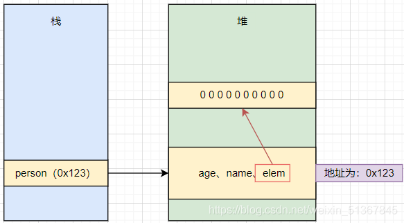 其中 person是一个引用它在栈上,而 elem 是数组,它也是引用,可是它却存放在堆中,所以引用不一定在栈上