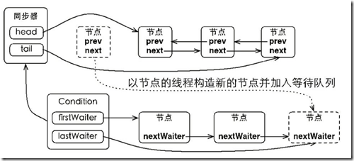 等待分为首节点和尾节点。当一个线程调用Condition.await()方法,将会以当前线程构造节点,并将节点从尾部加入等待队列。新增节点就是将尾部节点指向新增的节点。节点引用更新本来就是在获取锁以后的操作,所以不需要CAS保证。同时也是线程安全的操作。