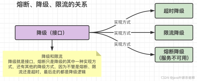 那既然不管怎样都会执行降级逻辑,这时候就可以理解为 降级是一种设计思想,在java层面就是一个接口,而熔断是降级的不同实现方式,他们的关系如下图: