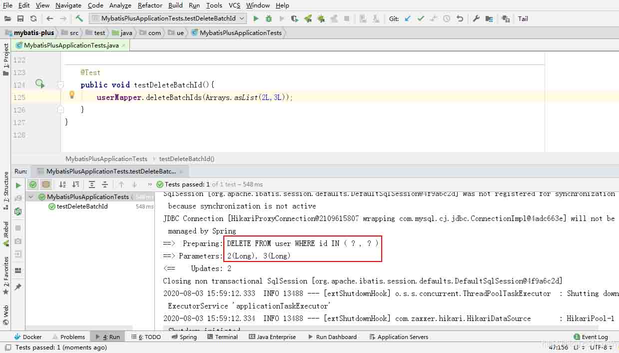 根据ID批量删除测试代码如下: