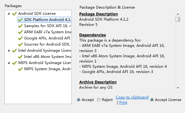 3.在新出现的界面中选择如下Accept或者Accept All,然后点击Install。Android SDK 管理器就开始下载并安装你所选的包了,我们等一段时间就OK了!