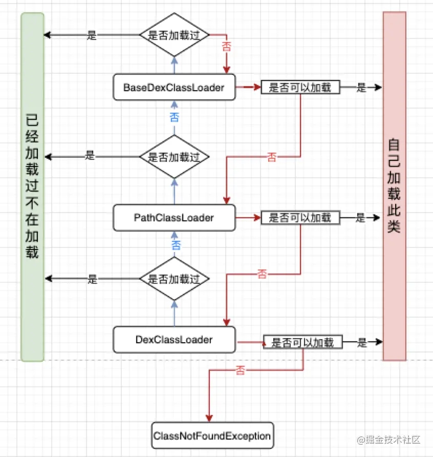 在Android系统中ClassLoader是用来加载dex文件的,有包含 dex 的 apk 文件以及 jar 文件,dex 文件是一种对class文件优化的产物,在Android中应用打包时会把所有class文件进行合并、优化(把不同的class文件重复的东西只保留一份),然后生成一个最终的class.dex文件