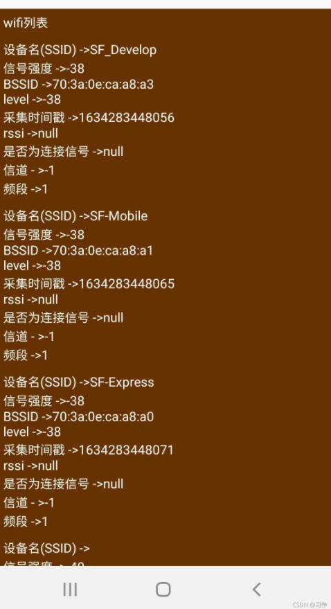 以上就是虚幻身影最近收集整理的关于Android获取wifi列表的方法的全部内容,更多相关Android获取wifi列表内容请搜索靠谱客的其他文章。