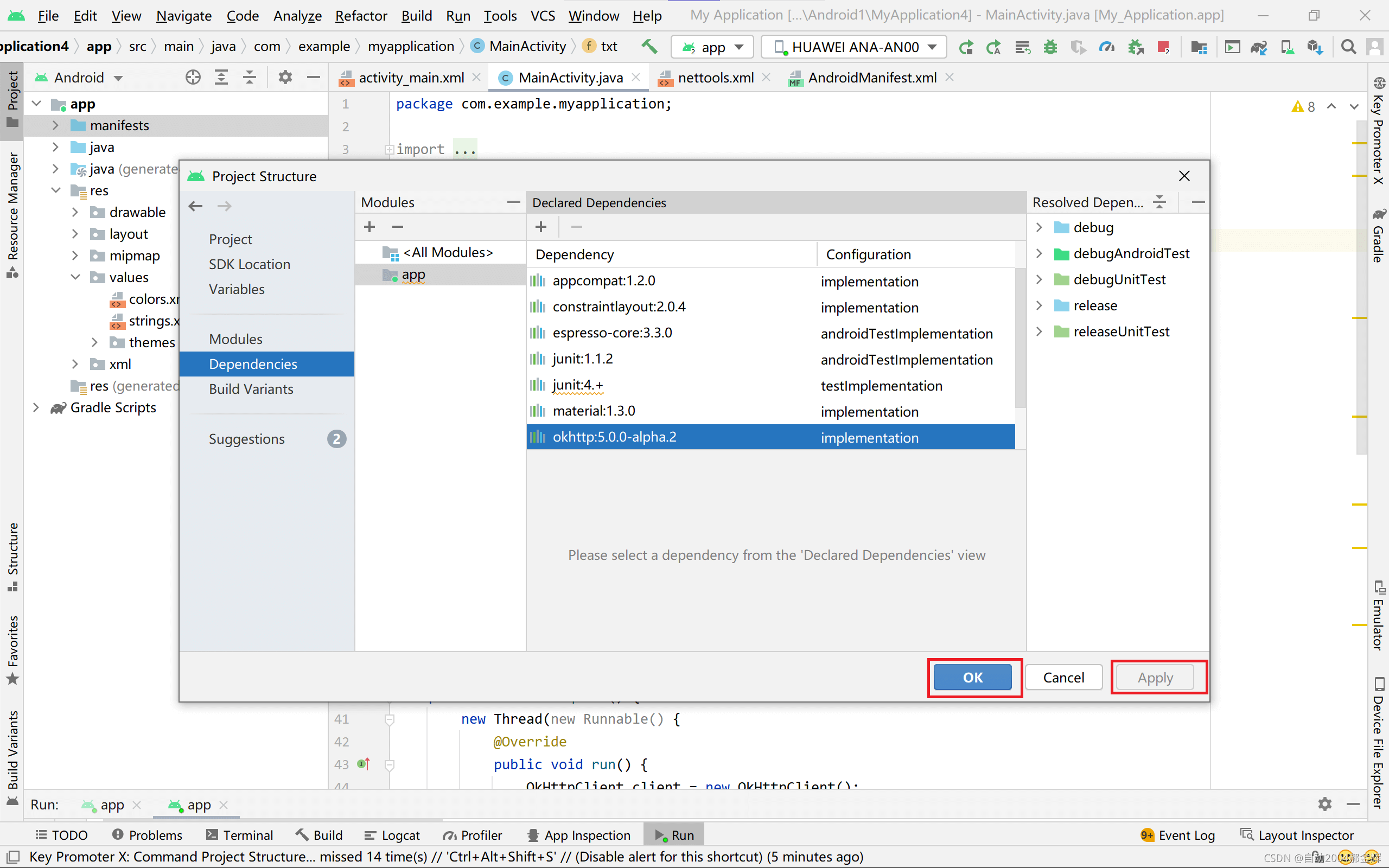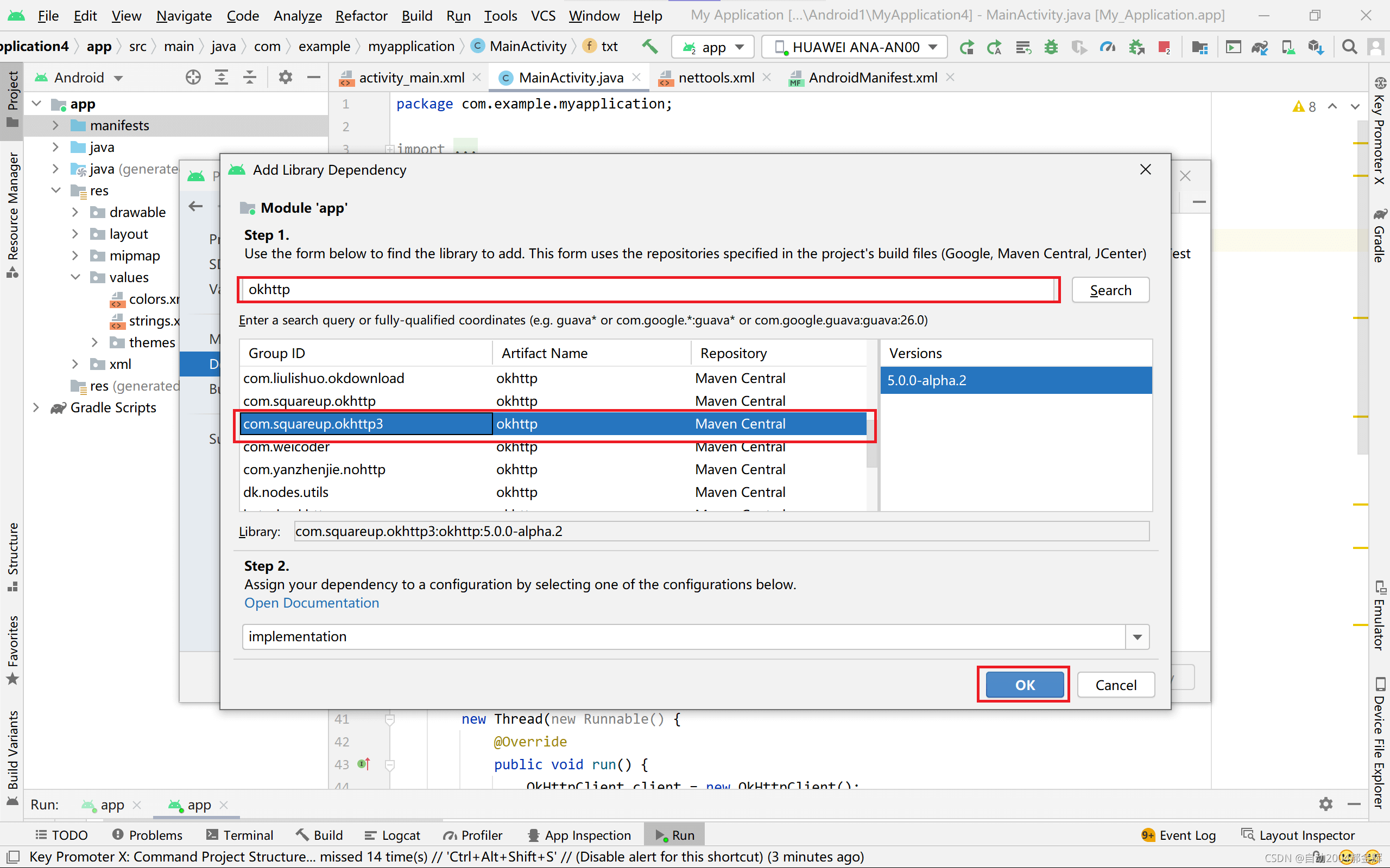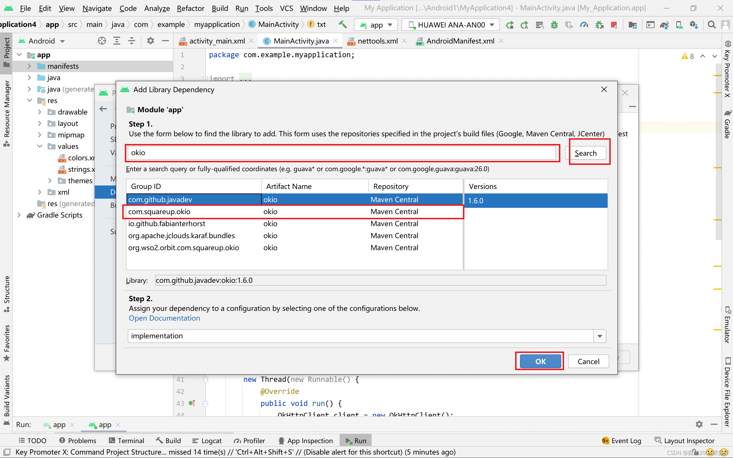 3.搜索okhttp,选择Com.squareup.okhttp3,点击ok按钮,此时可能需要较长时间