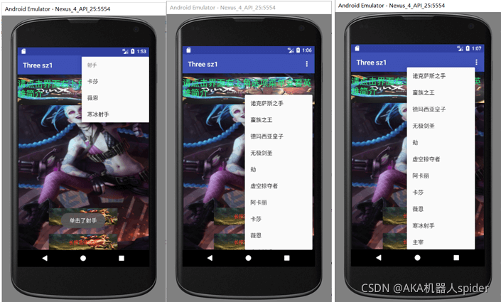 MainActivity.java运行结果、长按选择英雄和长按选择铭文结果如下: