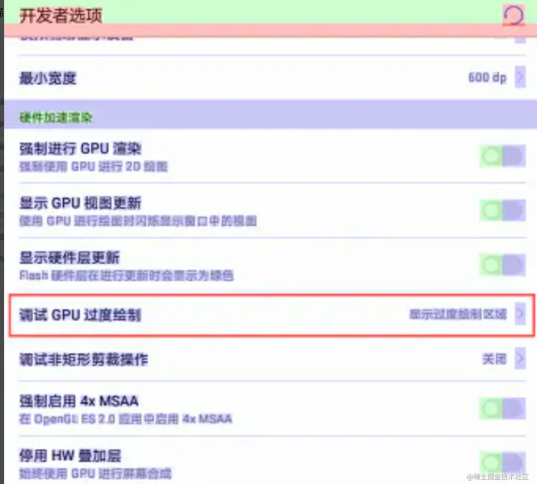 查看view是否过度渲染可在手机开发者模式开启以下设置: