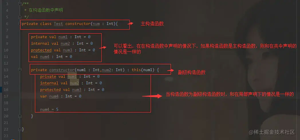 故而,当我们在构造函数中声明的情况下,如果是主构造函数的时候,是和在类(class)中声明的情况是一样的。如果是主构造函数的时候,则是和在局部声明的情况是一样的。