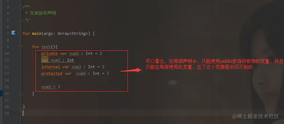 在局部声明的情况下,只能使用public修饰符修饰的变量。并且在变量只能在局部这个范围内使用,出了这个范围后就访问不到了。