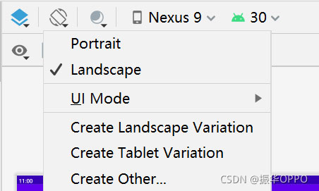 2、再选择这个旋转的图标,可以看到默认是Portrait(竖直排列),如果你使用的是平板模拟器,就可以选择Landscape(水平排列),UI Mode就是更换你UI的类型,一般不需要改动,其他不需要创建。