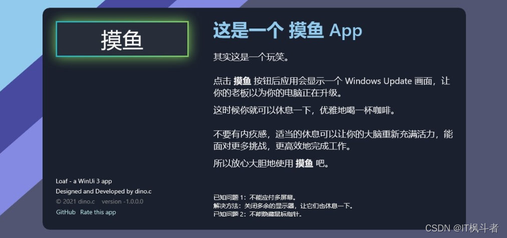 Win10商店上架了一款名为《摸鱼》的App,在下载打开之后,这个App会让你的电脑进入一个假更新的画面,让别人以为你的电脑正在升级,这时候你就可以休息一下,优雅地喝一杯咖啡。