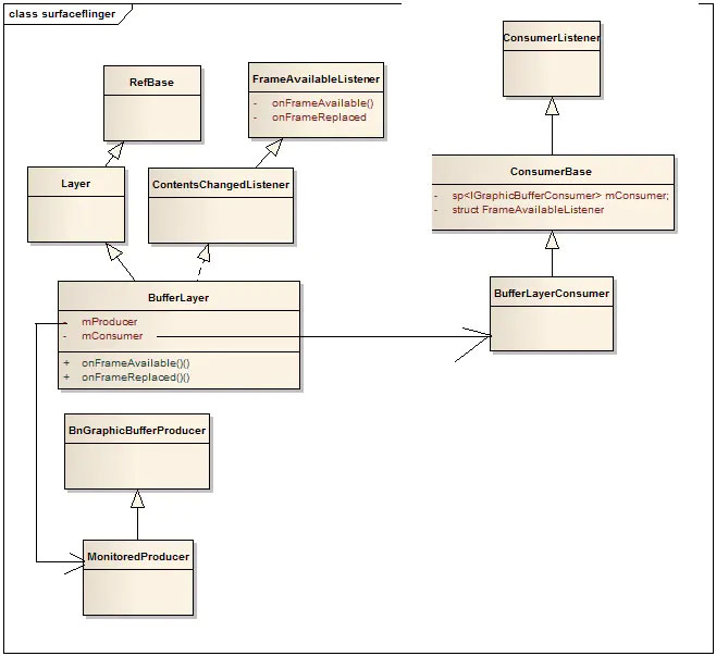 上面创建一个surface后,surfaceflinger对应的是一个layer,当上层layer调用刷新后,onFrameAvailable被调用,通知surfaceflinger有layer更新