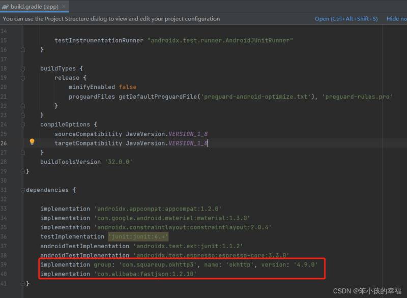 2.添加依赖,在app模块下的build.gradle中添加okhttp和json的依赖