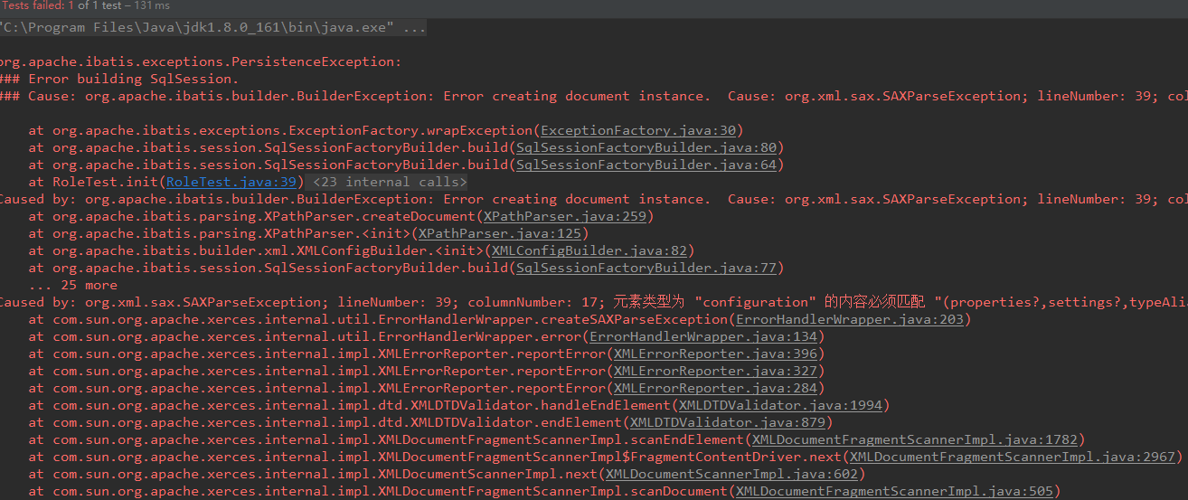 ### Cause: org.apache.ibatis.builder.BuilderException: Error creating document instance. Cause: org.xml.sax.SAXParseException; lineNumber: 27; columnNumber: 17; 元素类型为 "configuration" 的内容必须匹配 "(properties?,settings?,typeAliases?,typeHandlers?,objectFactory?,objectWrapperFactory?,