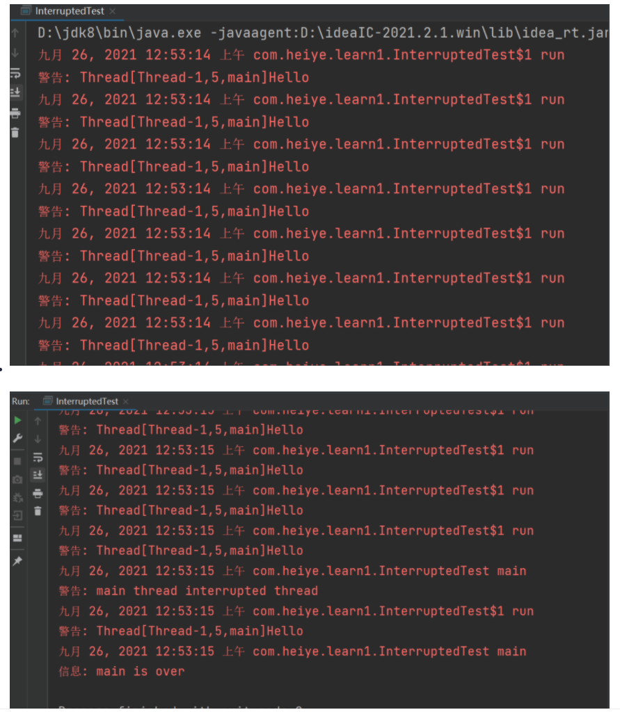 boolean intertupted()方法:检测当县线程是否被中断,如果是返回true,否则返回false。与isInterrupted()不同的是,该方法如果发现线程被中断,则会清除中断标志。