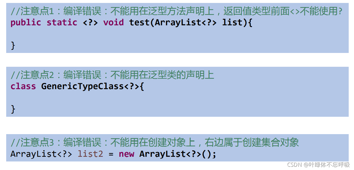 Collection<?> c = new ArrayList<String>(); c.add(new Object()); // 编译时错误