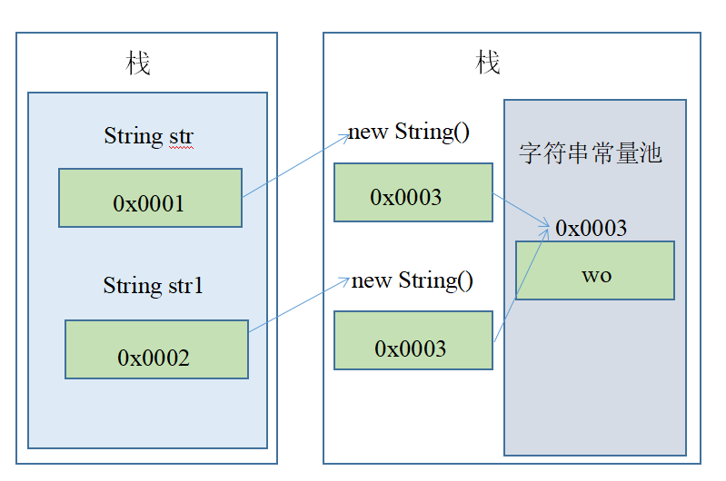 在上图中,栈存放的是字符串的引用,str和str1存放的都是对象“wo”的内存地址,==判断对象时,判断的是他们存储的内存地址是否相同,由上图可见,他们的内存地址是相同的,所以例一输出的是true。