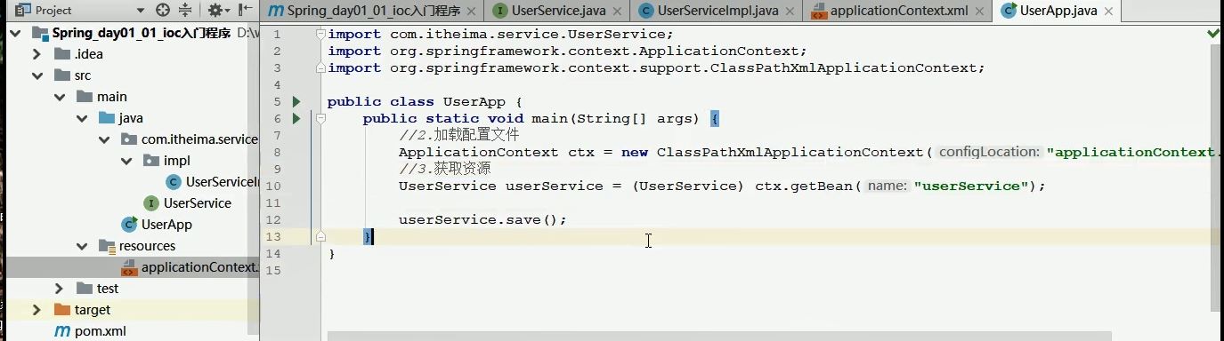 4.配置所需资源(Service) 为spring控制的资源5.表现层(App)通过spring获取资源(Service实例)