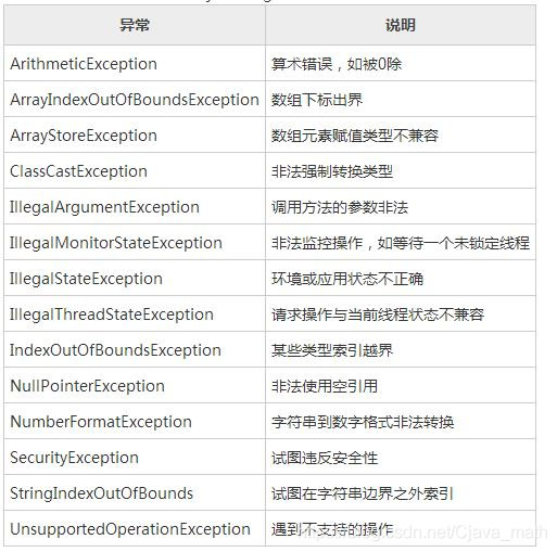 - 运行时异常是RuntimeException类及其子类的异常,是非受检异常,如NullPointerException、IndexOutOfBoundsException等。由于这类异常要么是系统异常,无法处理,如网络问题;