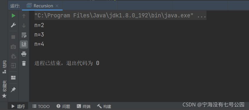 结果分析:大体上都跟前面的打印例子差不多,都是调用自身时在栈上开辟相应的栈帧,前面忘说了,栈帧其实会二次开辟的,啥意思呢,就是说调用方法时先在栈上分配一块较大的空间,也就是栈帧,而在栈帧内部还会进行一次具体的内存划分,具体到每一个变量。每个栈帧结束后将返回值返回给上一个栈帧,以此类推就能清晰明了的弄清楚递归的调用机制。