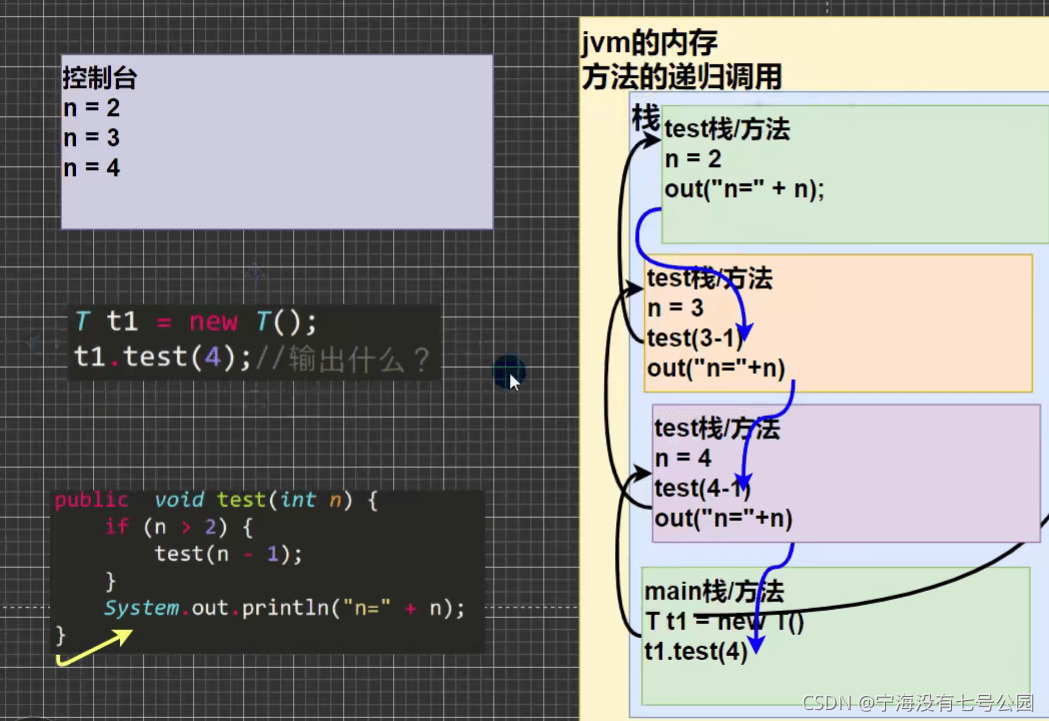 test(2)时,此时判断n大于2显然为false,此时便要执行方法的最后一句语句,也就是sout打印语句,此时便会先打印2,打印完2之后方法结束(被操作系统回收/资源销毁),返回到前一个调用此方法的栈帧中,也是以此类推,直到main方法结束。 - 具体机制见下图。