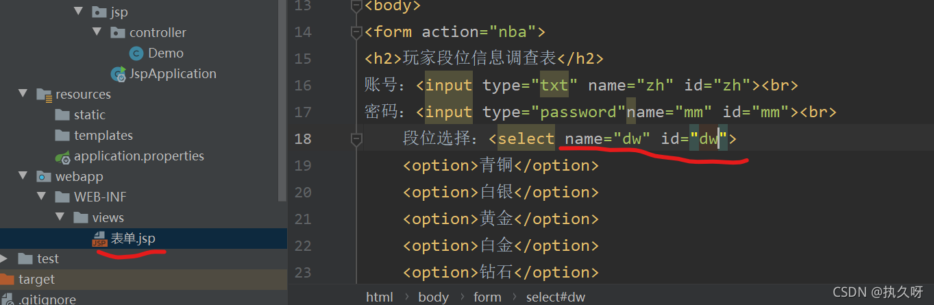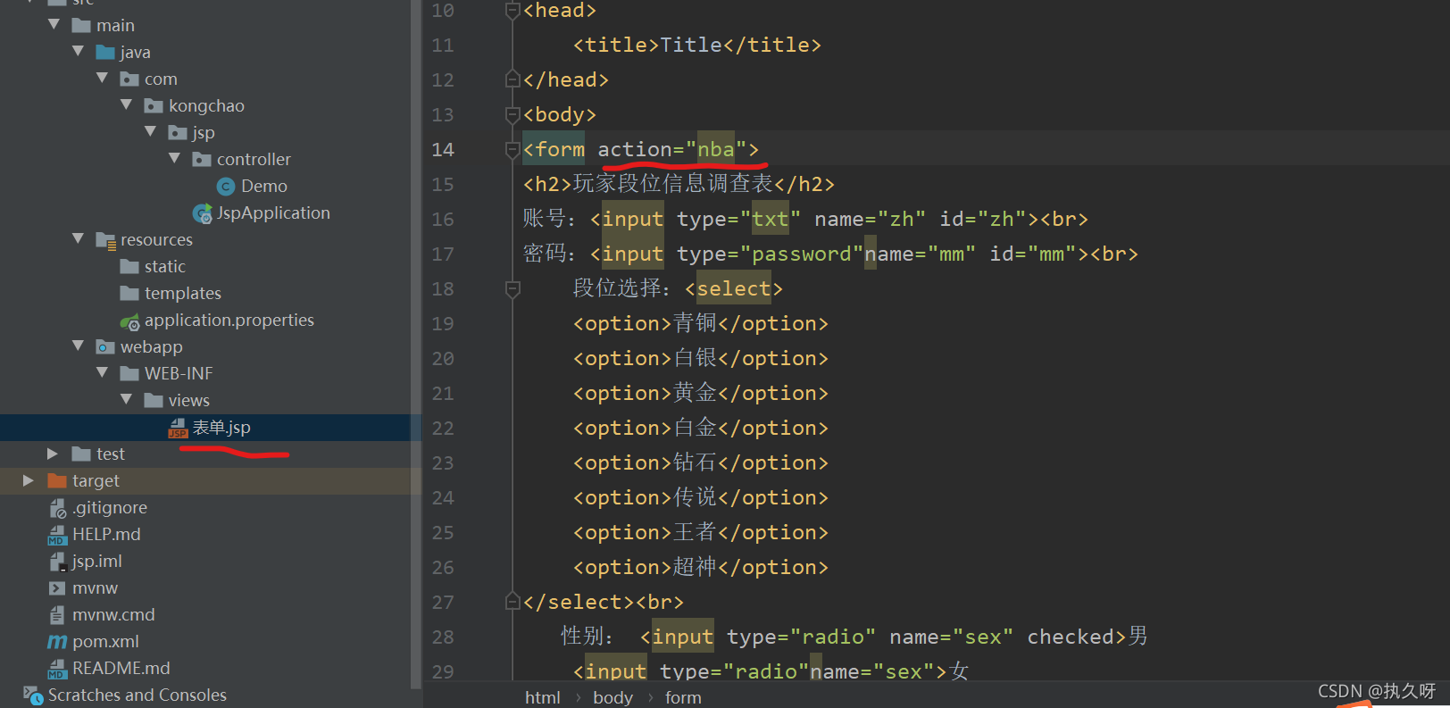 首先我们要先打开我们idea,如图,在jsp下的<form>也就是问卷的哪里加上action=" ",