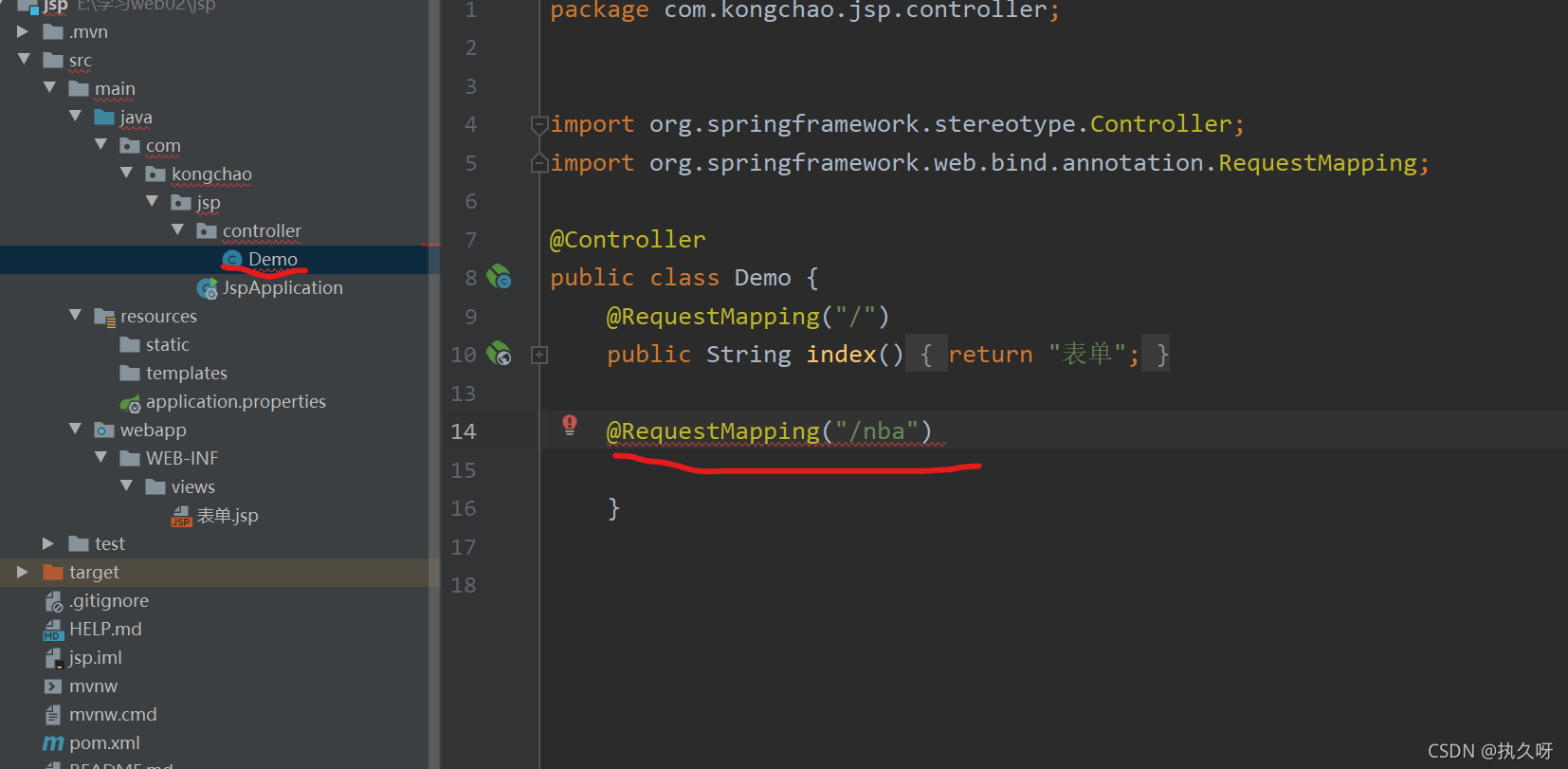 第二步:在Demo下的Demo类下输入划线内容,只需输入@R看着选到即可回车
