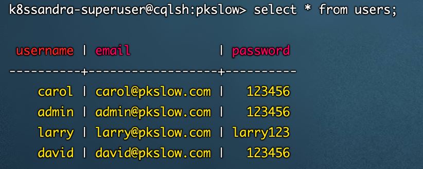 CREATE KEYSPACE pkslow WITH replication = {'class': 'SimpleStrategy', 'replication_factor': 1};