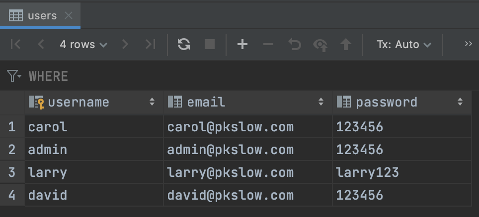 INSERT INTO users (username, password, email) values ('carol', '123456', 'carol@pkslow.com');