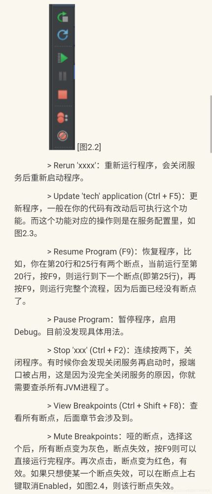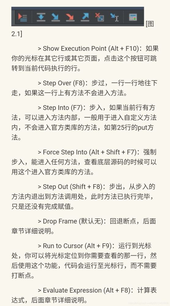 F2 跳转到下一个高亮错误 或 警告位置 (必备) F3 在查找模式下,定位到下一个匹配处 F4 编辑源 F7 在 Debug 模式下,进入下一步,如果当前行断点是一个方法,则进入当前方法体内,如果该方法体还有方法,则不会进入该 内嵌的方法中 F8 在 Debug 模式下,进入下一步,如果当前行断点是一个方法,则不进入当前方法体内 F9 在 Debug 模式下,恢复程序运行,但是如果该断点下面代码还有断点则停在下一个断点上 F11 添加书签 F12 回到前一个工具窗口 Tab 缩进 ESC 从工具窗口进入代码文件窗口 Ctrl + Shift + Alt + V 无格式黏贴 Ctrl + Shift + Alt + N 前往指定的变量 / 方法 Ctrl + Shift + Alt + S 打开当前项目设置 Ctrl + Shift + Alt + C 复制参考信息