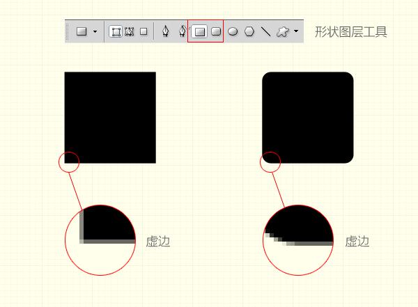 我们通常在PS里绘制矩形时会用 「矩形工具」,这样产生的是矢量的形状图层,它的好处是我们无论放大缩小时都保持矢量属性,但当我们放大视图看时还是有虚边(上图),这些虚边虽然在绘制大的图形时影响不太大,但当我们绘制很小的像素级图标时,就会很明显了。