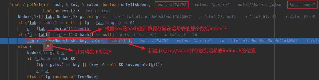 最后根据元素(key/value)新建节点并保存到指定数组index下标位置