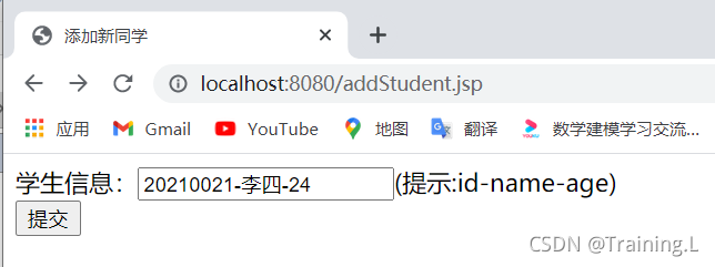 学生信息:<input type="text" name="student">(提示:id-name-age)<br/>
