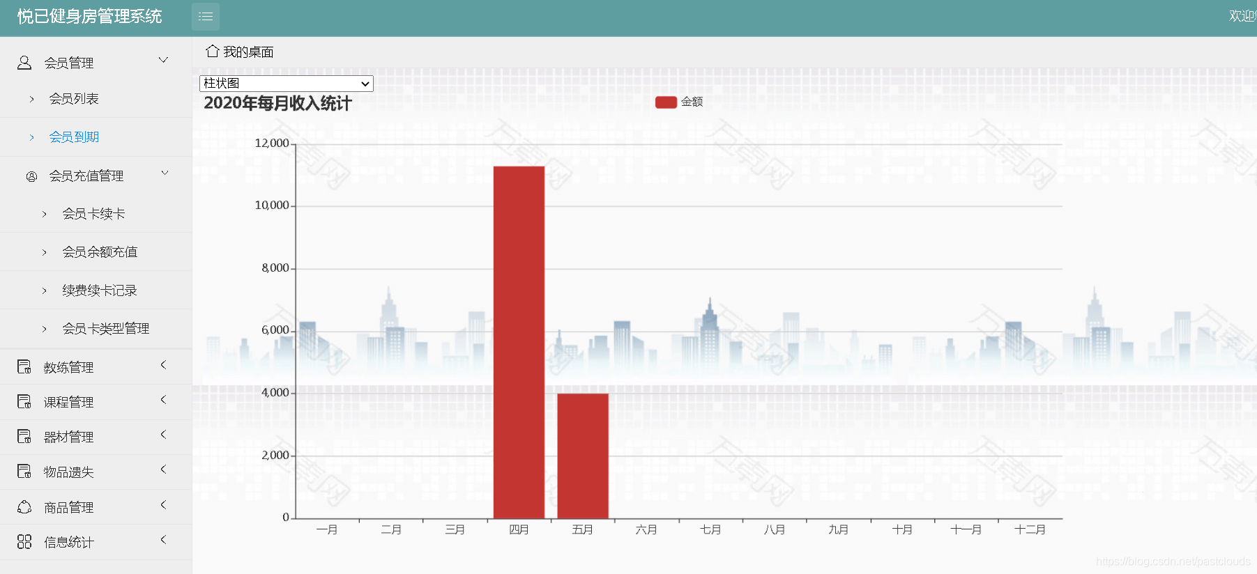 用户登录、首页主要功能有:会员信息管理、会员到期续费管理、充值管理、教练课程管理、私教管理、器材管理、小商品售卖管理、信息统计、修改密码等主要功能: