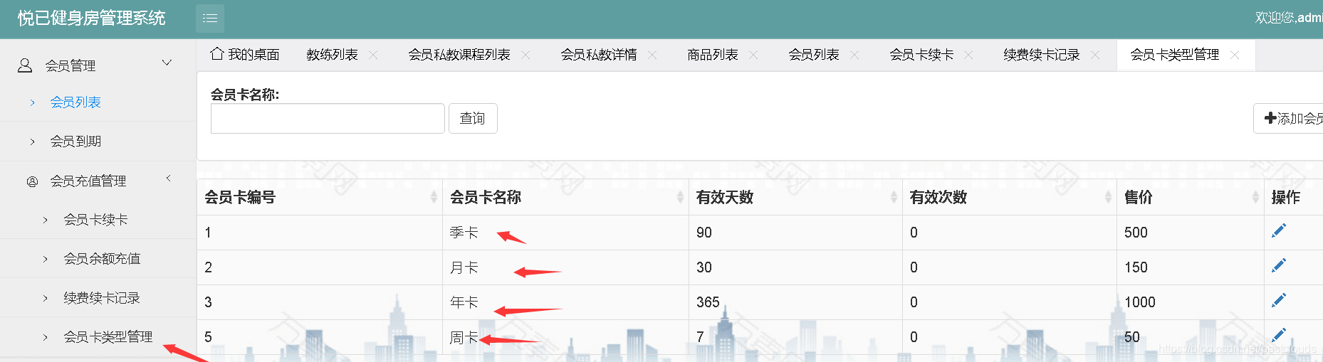会员管理、续卡、会员卡类型管理: